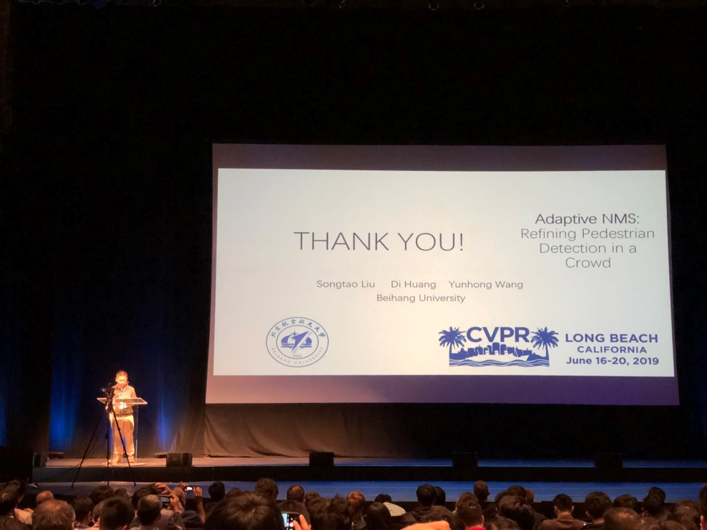 本次会议IRIP实验室刘松涛同学的论文” Adaptive NMS: Refining Pedestrian Detection in a Crowd (Songtao Liu, Di Huang, Yunhong Wang)”被录用为口头报告。齐梦实同学的论文” KE-GAN: Knowledge Embedded Generative Adversarial Networks for Semi-Supervised Scene Parsing (Mengshi Qi, Yunhong Wang, Jie Qin and Annan Li)”和” Attentive Relational Networks for Mapping Images to Scene Graphs (Mengshi Qi*, Weijian Li*, Zhengyuan Yang, Yunhong Wang and Jiebo Luo)” ,穆国栋同学的论文” Led3D: A Lightweight and Efficient Deep Approach to Recognizing Low-quality 3D Faces (Guodong Mu, Di Huang, Guosheng Hu, Jia Sun, and Yunhong Wang)”被录用为Poster。