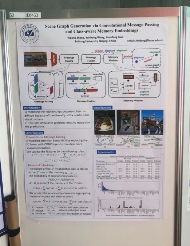 实验室的张浥东同学在会议上发表了视觉关系检测领域的论文《Scene Graph Generation via Convolutional Message Passing and Class-aware Memory Embeddings》,并在poster展示环节对其工作进行了介绍。该工作吸引了各国的参会学者,引起了各国同行的热烈讨论与关注。