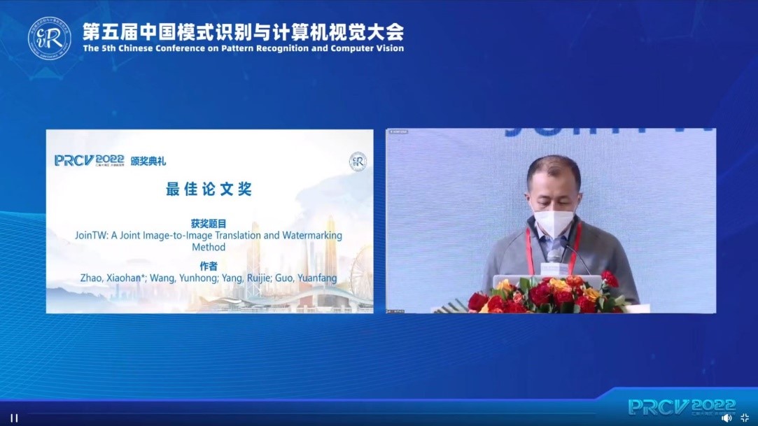 本次会议IRIP实验室赵晓涵同学的论文“JoinTW: A Joint Image-to-Image Translation and Watermarking Method”被录用口头报告,并获评最佳论文奖(Best Paper Award)。此外,借助会议专题论坛与讲习班的机会,与产学研各界科研人员进行深入交流与讨论,相关研究成果获得广泛关注。