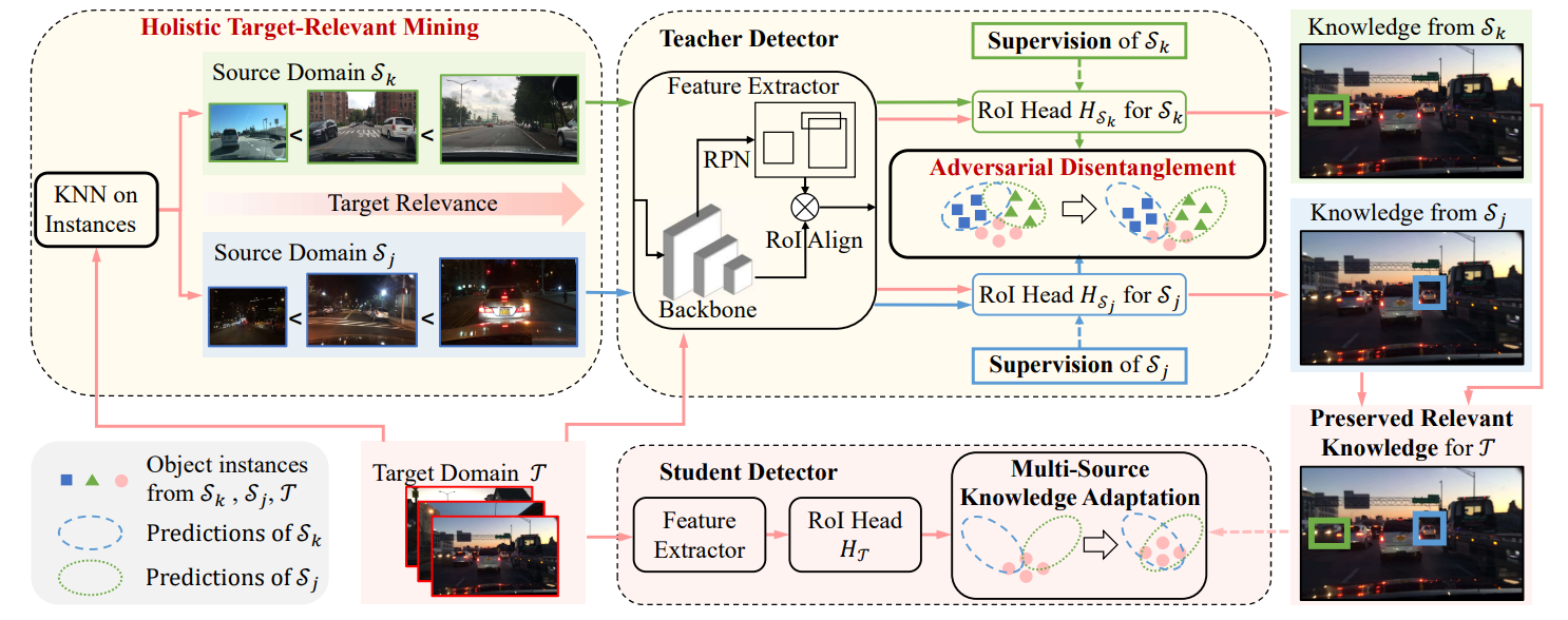 针对多源域下的无监督领域自适应目标检测任务,本文提出了一种基于目标领域相关知识保存的知识蒸馏方法。其中教师模型使用了一种基于对抗的多源域解耦模块,以此在自适应过程中保存各个源域特有的知识。同时本文还提出了一种全局的目标领域相关性挖掘方法,使得源域数据根据其和目标域的相关性进行加权。通过以上方法,教师模型更能捕捉到目标领域相关的知识,有助于指导学生模型进行跨域自适应目标检测任务。大量实验证明了其优越性。