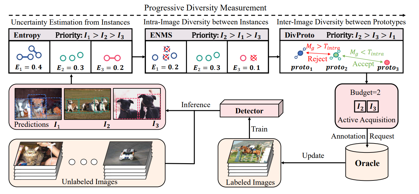 本文提出了一种新的混合主动学习目标检测方法,在目标实例层面自底向上地同时考虑了不确定性和离散型。该方法以两阶段的形式来平衡计算复杂度。第一阶段提出了一种基于熵的非极大抑制方法,其在特征空间中去除冗余预测,再以此为基础评估图像的整体不确定性。第二阶段提出了一种离散原型策略,基于熵计算每张图像各个类别的原型向量,通过实现类别原型的类内离散性和类间离散性来保证采样图像间的离散型。大量实验证明了该方法的有效性。