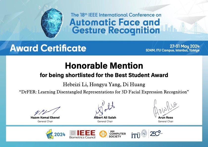 实验室共有两篇文章被FG 2024接收,李国豪同学的“3D Face Modeling via Weakly-supervised Disentanglement Network joint Identity-consistency Prior”被接收为poster和spotlight展示,李何贝子同学的“DrFER: Learning Disentangled Representations for 3D Facial Expression Recognition”被接收为oral展示,并获最佳学生论文提名奖(Honorable Mention for the Best Student Award)。